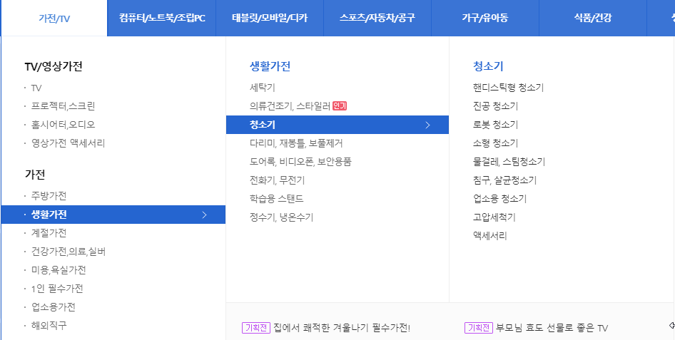 가전/TV->생활가전->청소기를 클릭해주세요.