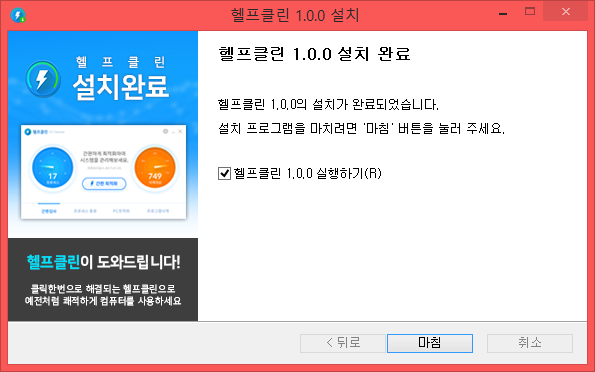 헬프클린(Help Clean)이 설치가 완료되었습니다. 설치가 완료되었으면 실행해주세요.