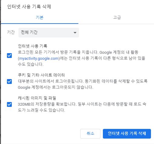 인터넷 사용 기록 삭제를 누르면 인터넷 사용 기록이 삭제가 완료됩니다.
