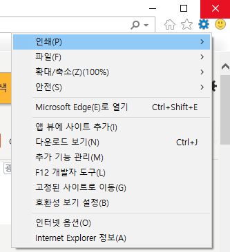 톱니바퀴를 눌러 인터넷 옵션(O)를 클릭해주세요.