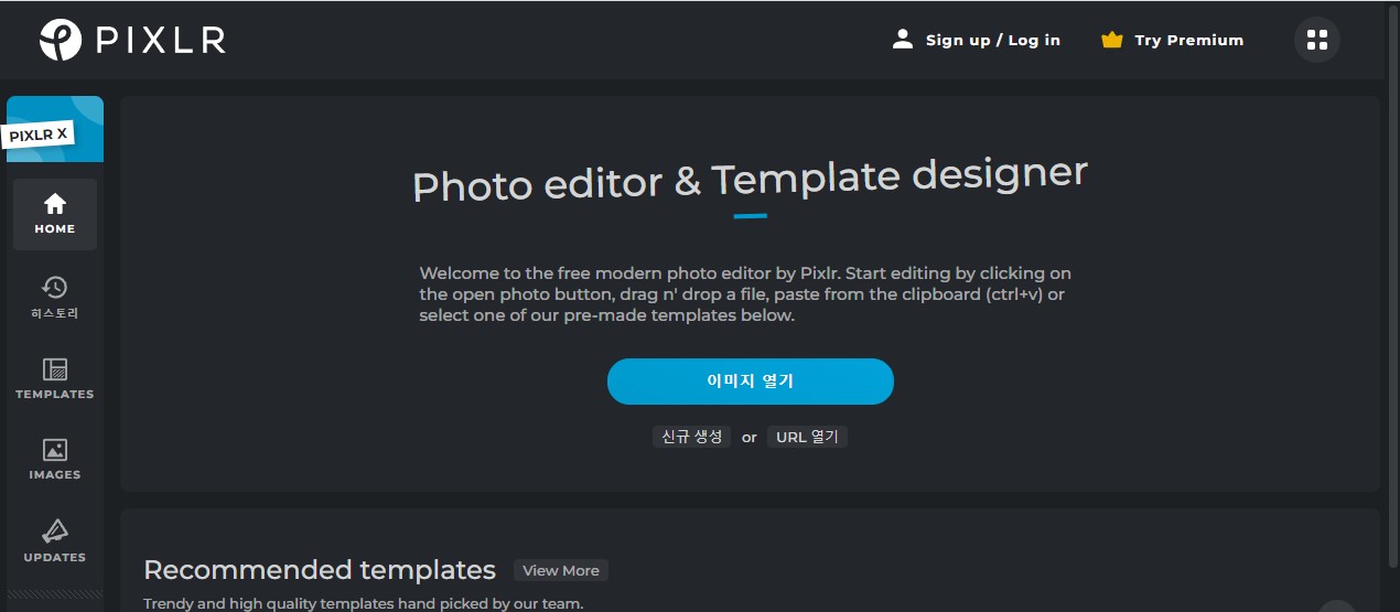 픽슬러의 사용방법은 매우 간단합니다. 이미지 열기를 누르고